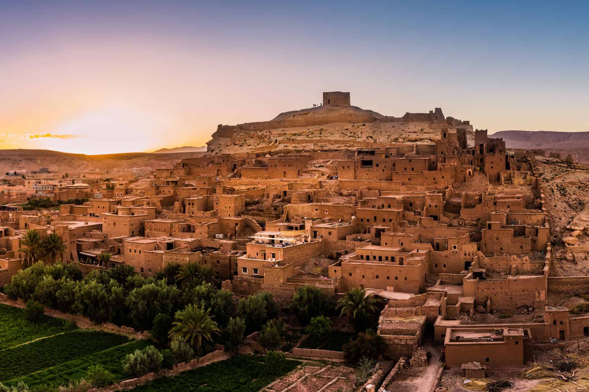 El primer día de la Ruta de 4 días desde Marrakech a Fes vía desierto, su chófer/guía le recogerá en su alojamiento de Marrakech. El viaje comienza con un recorrido panorámico por las majestuosas montañas del Atlas, cruzando el impresionante paso de Tizi N’tichka, que ofrece unas vistas impresionantes a una altitud de 2.260 metros. Le espera una visita a la histórica kasbah de Ait Benhaddou, declarada Patrimonio de la Humanidad por la UNESCO, seguida de un delicioso almuerzo en un restaurante local.